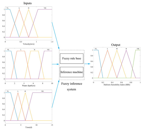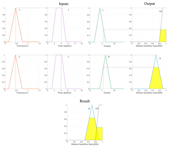 A fuzzy inference system is composed of a fuzzy rule base and an inference machine. The fuzzy rule consists of if–then fuzzy rules, such as ”if x IS A AND y IS B, THEN z IS C”, by links the input variables to output. In the same way, the fuzzy rules as a total of 64 (velocity with four linguistic values, water depth with four linguistic values, and water temperature lag time with four linguistic values) describing HS for the spawning period of C. idella are created based on literature reviews and expert experience [49,50,51]. The fuzzy rules for the spawning of C. idella is shown in Table 1. The water temperature lag time is used as an evaluation index of the fuzzy model. The water temperature lag time indicates the time required for the outflow water temperature to reach the same water temperature when the reservoir inflow water temperature (21 °C) is suitable for C. Idella to spawn. By using this fuzzy rule base, the Mamdani–Assilian inference was used in the current application. An example of a fuzzy inference process is described in Figure 7. The first line and second line show three inputs and a single output. The third line depicts how three input values are partial members of three linguistic variables for ”velocity”, ”water depth” and ”water temperature lag time”. This leads three fuzzy rules to be activated. The implication operator determines the partial membership to the output. These are aggregated into an output surface.