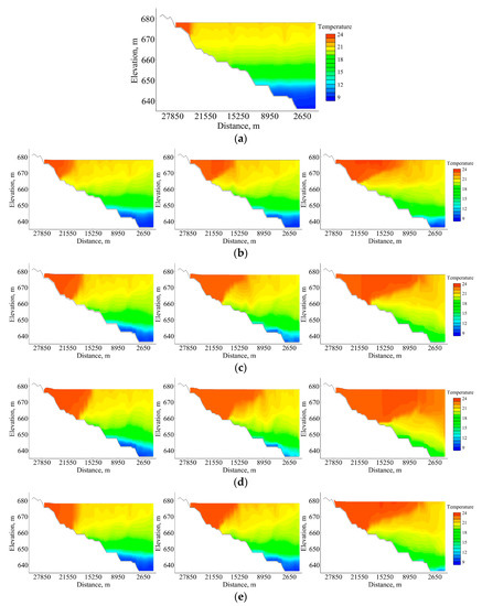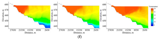 Results of thermal stratification simulation: (a) Initial thermal stratification of the reservoir; (b) inflow, 40 m3/s and outflow, 40 m3/s (from left to right: 1 day, 3 days, 5 days); (c) inflow, 100 m3/s and outflow, 100 m3/s (from left to right: 1 day, 3 days, 5 days); (d) inflow, 140 m3/s and outflow, 140 m3/s (from left to right: 1 day, 3 days, 5 days); (e) inflow, 100 m3/s and outflow, 80 m3/s (from left to right: 1 day, 3 days, 5 days); (f) inflow, 100 m3/s and outflow, 120 m3/s (from left to right: 1 day, 3 days, 5 days).