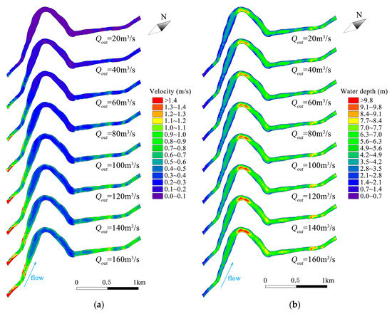 The spatial distribution of velocity and water depth under different reservoir outflows: (a) velocity and (b) water depth.