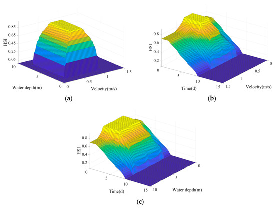 Output for habitat suitability index (HSI) after defuzzification. (a) HSI of velocity and water depth, (b) HSI of velocity and water temperature lag time, and (c) HSI of water depth and water temperature lag time.