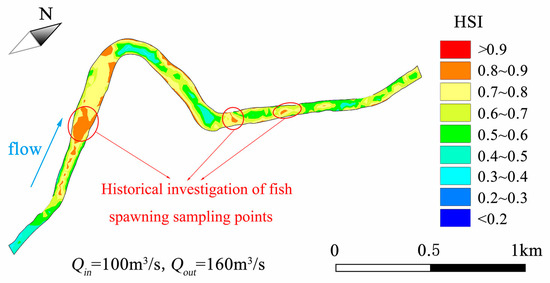 For further analysis of the simulation results, several scenarios are selected for analysis. The spatial distribution of habitat suitability for several scenarios is shown in Figure 12 and Figure 13. According to the simulation results of velocity and water depth in Figure 12 and Figure 13, the velocity is larger at the dam site, but the excessive velocity leads to poor habitat suitability. The water depth at the bend of the river is deep, and the deepwater depth leads to poor habitat suitability.