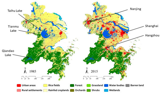 The Yangtze River Delta of Eastern China showing land cover/land use as of 1985 and 2015. Taihu Lake, and the locations of Tianmu Lake and Qiandao Lake, are indicated on the left. Major cities are identified on the right.