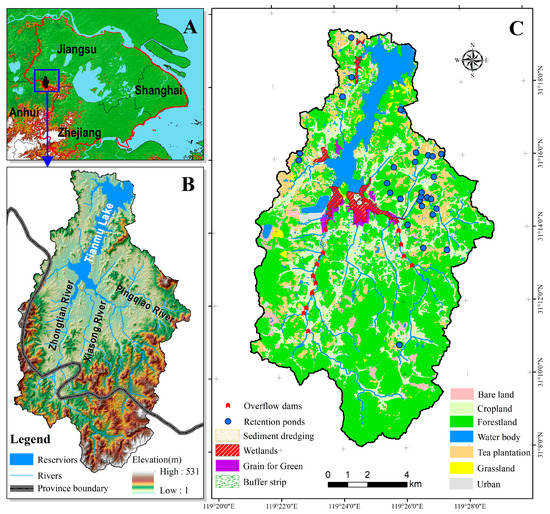 The Tainmu Lake watershed. (A) Location of the watershed in the Yangtze River Delta. (B) Topographic map of the watershed showing the lake and the principal rivers that enter it. The dark line separates Jiangsu Province to the north from Anhui Province to the south. (C) Land cover/land use in the watershed as of 2017.
