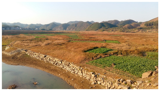 The impoundment of Qiandao Lake submerged a rich river valley, triggering profound changes in land cover/land use in the surrounding basin. More than 120,000 farmers were displaced, and this reshaped agriculture in the region by reducing the amount of arable land available for crop production [62,67,69]. Some displaced farmers became fishermen or moved away [70], but many relocated to higher ground and cleared erodible land on steep slopes [71]. Other agricultural areas have appeared in protected zones near the shore, where they have illegally displaced natural vegetation that serves as an ecological buffer [71]. Some fields (Figure 4) even occupy land that temporarily emerges from the lake during drier parts of the year [69].