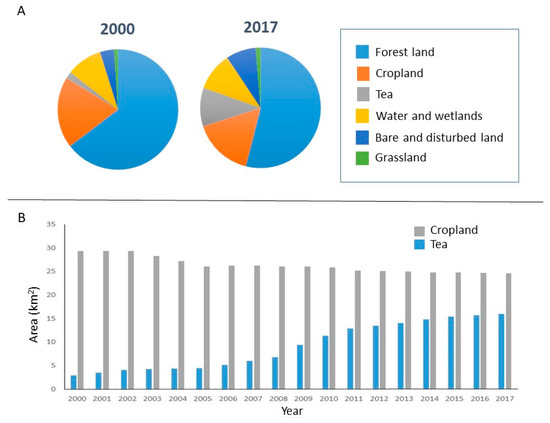 Changes in land cover/land use in the Tianmu Lake watershed between 2000 and 2017. (A) Land cover/land use in the years 2000 and 2017. The category bare and disturbed land includes construction land, and in 2017, land removed from crop production and returned to its natural state. (B) Year by year changes in the area devoted to cropland and tea production.