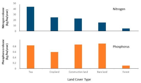 Detailed information on total nitrogen (TN) and total phosphorus (TP) release from different land cover categories in the Tianmu Lake watershed is available, and that has facilitated hydrological modeling’s pinpointing of principal areas of concern [82,83]. Although forested areas remain the dominant land cover, they release relatively small amounts of TN and TP annually on a per hectare basis (Figure 6). Other land use categories represent varying degrees of disturbance. In each case, annual per hectare release of nutrients into the environment greatly overshadows that of forests—by a factor of three to eight in the case of TN and five to eight in the case of TP. The contribution of tea to nutrient runoff, especially that of TN, is disproportionately high (Figure 6) and associated with hotspots, most of which are near the lake [55]