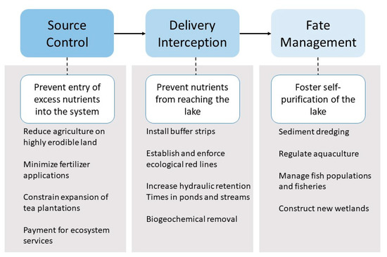 The first and most desirable priority is simply to exclude unwanted nutrients from entering the basin of interest (Figure 7). Source control can take a variety of broad forms, some of which reflect specific governmental policies, such as the PES scheme in place at the Qiandao Lake watershed. Others, such as the 1991 directive from Beijing that prohibits agricultural fields on hillsides with slopes greater than 25 degrees, and the Grain for Green program, a generalized PES scheme that provides subsidies and other incentives to remove sensitive land from agricultural production [120,121], are not tailored to any specific ecological zone [81]. China has also established ecological red line areas that prohibit all forms of development in the most sensitive lakeshore areas and sharply curtail activities in others [22,71,122,123]. Although analogous regulatory strategies to exclude nutrients may be difficult to implement in other countries [103], a reduction of fertilizer application rates, checks on the expansion of agriculture, and the regulation of aquaculture, all are widely feasible approaches.
