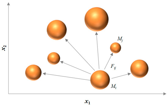 GSA is a novel swarm-based evolutionary algorithm inspired by the universal gravitation and mass interactions in classical Newton’s Mechanics [54]. In GSA, the potential solution for the target optimization problems is considered to be an agent with a certain quality, and all the agents are attracted by other agents via the so-called gravity force, which can effectively help the swarm share the acquired beneficial information about the surrounding [55]. Figure 1 draws the sketch map of the GSA method. It can be seen that during the evolutionary process, the gravity force of the two agents is directly and inversely proportional to their qualities and distances, respectively; while the agents with better performances usually have larger attraction forces and slower velocity than those agents with smaller quality. By these means, all agents gradually finish the transition from the global exploration to local exploitation in the decision space, which help the swarm obtain the global optima.
