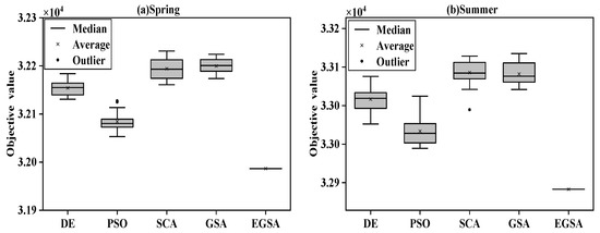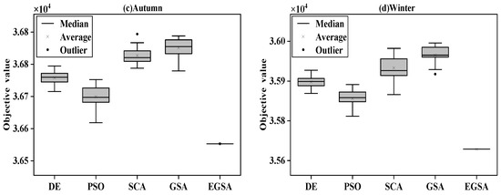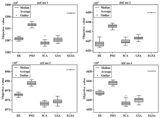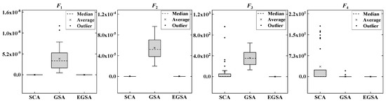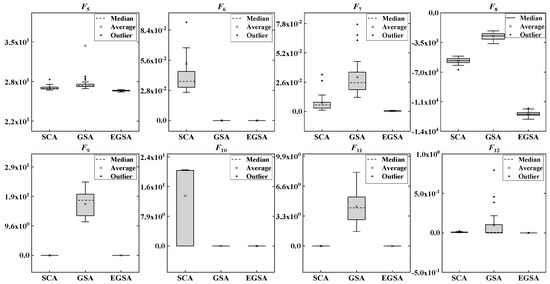 In this section, the box and whisker test was employed to demonstrate the objective distribution of the solutions since it can show the abundant information (including minimum, second and third quartile, median, and maximum) on the studied data. Figure 2 shows the detailed data obtained by the three methods in 30 independent runs. It could be clearly observed that compared to the other methods, the proposed method had a smaller distribution and better values in all indices. For instance, the standard GSA algorithm had different degrees of outliers on F4–F5, which indicated that this method easily fell into the state of premature convergence in the search process; the SCA algorithm exhibited outliers in most functions but had a distribution of relatively discrete solutions in F3, which indicated that SCA was not ideal in terms of robustness. Additionally, the EGSA method had a more concentrated solution distribution and fewer outliers in all functions, demonstrating its satisfying robustness and search ability. Thus, the performances of the EGSA method were superior to the comparative methods in the 12 functions.