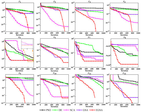 Figure 3 shows the convergence trajectories of five algorithms for 12 functions with 30 variables. It can be seen that the proposed method could constantly improve the solution’s quality from the beginning to the end, and could find the best solutions in the end. Taking the functions F1–F4 as examples, three methods (GSA, PSO, and DE) quickly fail into local optima because their best-so-far solutions change slightly in the evolutionary process; both EGSA and SCA converge to a smaller objective at the initial stage, but EGSA can quickly find better solutions at iteration 800, while SCA fails to make it. Additionally, for multimodal functions, EGSAs achieve the global optimal solution in both F9 and F11, and better results than other methods in F8, F10, and F12. Thus, the above analysis fully proves that the presented method has a superior convergence speed and global search ability.
