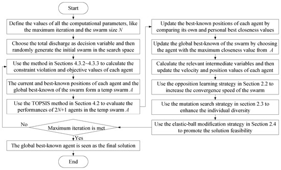 Gravitational search algorithm (GSA) is a famous evolutionary algorithm based on the laws of gravity and mass interactions in Newtonian mechanics [51,52,53]. Although GSA outperforms the standard PSO and GA methods in many problems, certain defects (like exploration–exploitation imbalance and local convergence) still exist. For improving the performance of the standard GSA method, this study proposes an enhanced GSA algorithm (EGSA) where three modified strategies (opposition learning strategy, mutation search strategy, and elastic-ball modification strategy) are integrated to alleviate the premature convergence problem. Several famous test functions are used to verify the feasibility of the developed method in solving the global optimization problems, and the results demonstrate that the modified strategies could effectively enhance the convergence speed and the global search ability of the population at the same time. Then, two specific strategies were embedded into the EGSA method to help address the multi-objective operation problem of a hydropower system—(i) the practical constraint handling strategy for solution feasibility and (ii) the Technique for Order Preference by Similarity to an Ideal Solution (TOPSIS) for multi-objective decision. Finally, the EGSA method was applied to address the operation optimization of cascade hydropower system in the Wu River of China. The simulations showed that the proposed method could produce better scheduling schemes in different application scenarios.