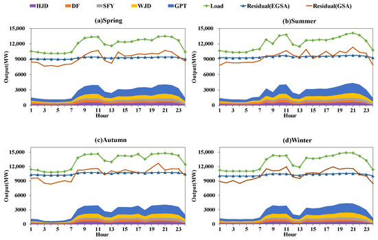 In modern power systems, the hydropower system is often asked to respond to the peak loads of power grid to produce a relatively smooth load series for other kinds of energy systems (like thermal, solar, and wind) [74,75,76]. In this way, the total operational cost of the electrical power system in the long run can be sharply reduced [77,78,79]. Hence, the second objective function was chosen to minimize the mean square deviation of the residual load curve obtained by subtracting all power outputs of hydropower reservoirs from the original energy load curve, which could be expressed as:
