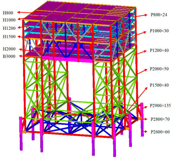 The geometric dimensions of each component of the platform model are determined according to the geometric scale and the inertia radius scale. Schematic diagram of the electrical platform is shown in Figure 1. The parameters of the superstructure model are shown in Table 2. The jacket structure mainly consists of cylindrical steel pipes. Both the length and outer diameter of the members and the pile legs are scaled by the geometric scale of 1:60; therefore, the hydrodynamic characteristics of the platform can be simulated accurately. The pipe section of the pile leg was calculated according to the area scale to achieve the accurate simulation of the elastic response of the structure (see Table 3).