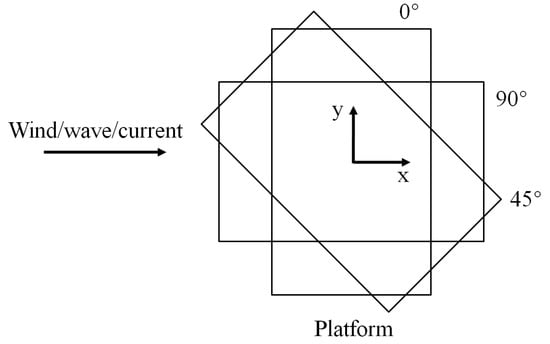 The laboratory experiments were conducted in a wave and current flume at the State Key Laboratory of Coastal and Offshore Engineering (SLCOE), Dalian University of Technology, Dalian, China. The flume is 60 m long, 4.0 m wide, and 2.5 m deep. The flume is equipped with wind, current, and wave systems. In the actual sea area, the electrical platform may be subjected to wave, current, and wind from various directions, resulting in the electrical platform being subjected to loads in different directions. In this test, three incident directions of external loads, namely 0°, 45°, and 90°, are adopted to analyze the hydrodynamic response of the electrical platform (see Figure 2). The electrical platform model and its layout in wave flume are shown in Figure 3.