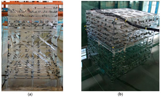 The electrical platform model in the wave flume. (a) In air; (b) In water.
