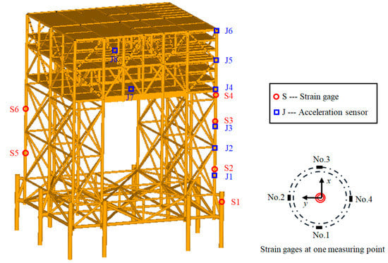 In the physical model test, wave parameters were measured by capacitive wave gauge with a measuring range of 35 cm and a relative error of 0.5%. Wave height and period can be collected and calculated automatically with the wave height acquisition system. The ADV current meter of Nortek company was used for velocity collection. The sampling rate of this instrument was 200 Hz, the measuring range was 1 m/s, and the measured accuracy was 0.5%. The laboratory adopts blowers to generate wind, and the measurement of wind speed is carried out by a thermal anemometer. The measuring range is 0.3~30 m/s, and the measuring precision can be controlled within 1%. A NI (National instruments) data acquisition instrument was used to collect strain data at key positions of the structure in combination with strain gauge. The waterproof acceleration sensor is adopted to measure the acceleration response of key positions at the platform structure (see Figure 4). The measuring range of the acceleration sensor is 1.0 g and the accuracy is approximately 0.3%. The measuring frequency is up to 1000 Hz, which has high stability and anti-interference ability. The arrangement of measuring points in physical model test is very important for obtaining effective data. The data of measuring points can reflect the load on the weak position of the electrical platform. If the measuring points are not arranged reasonably, the validity and reference value of the data will be reduced. This study determined key nodes and positions of the electrical platform using the finite element analysis. The strain gauge and the acceleration sensor were arranged as shown in Figure 5.
