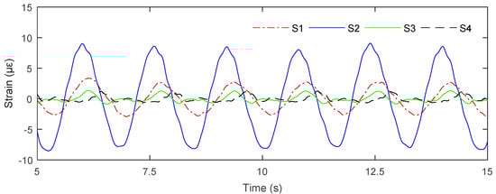 Under the water depth of operating condition, the dynamic responses of the electrical platform in regular waves are studied. Strain gauges were used to collect the strain response of structural piles. Taking the measurement results of four strain gauges at measuring point S5 at 0° angle of attack as an example, the time-history curves of structural strain response measured by different strain gauges along the circumference of a pile leg are shown in Figure 6. It can be seen from the experimental results that the strain-response value of strain gauge No. 1 at the measuring point S5 is greater than that of the other three strain gauges at the same measurement position. Similarly, the strain response of strain gauge No. 1 at position S6 is greater than that of other strain gauges. The strain response of strain gauge No. 3 at positions S1, S2, S3, and S4 is larger than that of other strain gauges. This is mainly due to the relative position of the measuring points. Measuring points S1, S2, S3, and S4 are on the wave side of the platform, while S5 and S6 are on the leeward side of the structure.