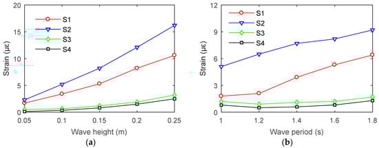 Taking the test conditions with a period of 1.6 s as an example, the maximum strain at measuring points 1, 2, 3, and 4 changes with wave height, as shown in Figure 8a. Within the range of wave height of 0.25 m, the structural strain response increases with increasing wave height. For wave height of 0.15 m, the results of maximum strain at measuring points 1, 2, 3, and 4 are shown in Figure 8b. Overall, the strain value of the structure increases with the increase of wave height. The experimental results show that the strain response at the measuring points 1 and 2 increases with the increase of the wave period from 1.0 to 1.8 s. However, the strain response at measuring points 3 and 4 is not sensitive to the wave period.