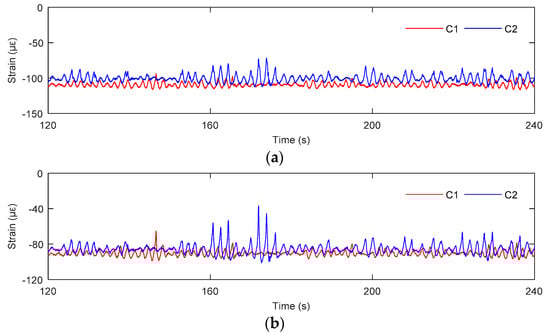 The strain response of the pile leg was analyzed under storm conditions of C1 and C2. The comparison results of the time history of strain response at different measuring points are shown in Figure 9. According to the analysis results, the strain at different measuring points in storm condition C2 is significantly larger than that in C1. Under the same environmental load, the strain values of strain gauges No. 2 and No. 4 were very large, followed by strain gauge No. 1, and strain gauge No. 3 had a minimum strain.