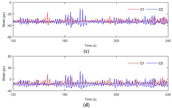 Time-series of the strain response at various measurement positions in storm conditions. (a) S1; (b) S2; (c) S3; (d) S4.