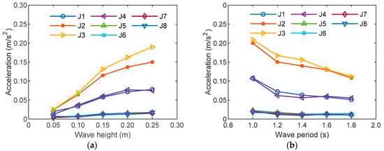 In this study, the peak value of the acceleration response of the structure is taken as the key index to reflect the motion response of the electrical platform. Under the action of different regular waves, the acceleration response of the structure at different positions is shown in Table 8. Figure 10 shows the variation of the peak value of acceleration response with wave height and wave period at various measurement points of the structure. It is indicated that when the wave period is constant, the acceleration response of the measurement point of the structure increases with the increase of wave height. While the wave height is constant, the acceleration response of the measuring point decreases with the increase of the period. Overall, the peak value of acceleration response at measuring point J3 is the largest under different wave conditions. However, the acceleration response at measuring points J5, J6, J7, and J8 is not sensitive to the changes of wave height and period.