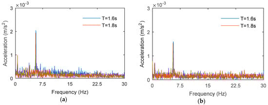 Frequency-domain comparison of acceleration responses at measurement positions J7 and J8 in waves. (a) J7; (b) J8.