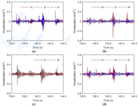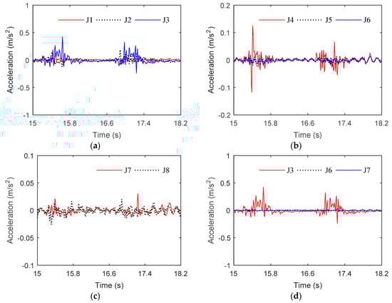 Time-series of the acceleration response at various measurement positions in storm condition C2. (a) J1, J2, J3; (b) J4, J5, J6; (c) J7, J8; (d) J3, J6, J7.
