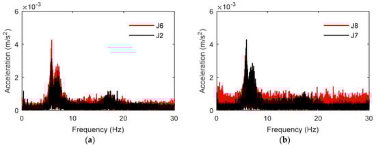 Frequency domain comparison of acceleration responses at various measurement positions in storm condition C2. (a) J2 and J6; (b) J7 and J8.