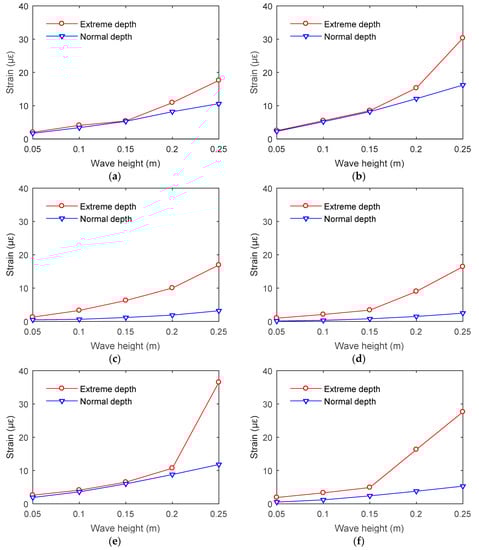 The electrical platform structure presents different characteristics of the hydrodynamic response under normal and storm conditions. When the water depth changes, the hydrodynamic response of the structure will be different, even if the wave state remains the same. The structural strain peaks at different positions under the action of regular waves with an attack angle of 0°are shown in Figure 15. When the wave height increases, the strain of the structure increases in both extreme and normal water depths. Moreover, the strain peak of the structure in extreme depth is larger than that in normal depth.