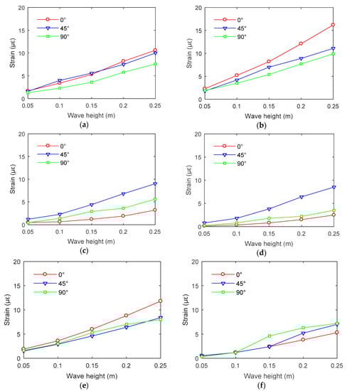In this study, three attack angles between the environmental loads and the platform structure were considered. Under the same environmental loads, the attack angle has a significant influence on the structural strength and motion response. However, from a perspective of practical engineering, structural strain is more closely related to structural safety. Therefore, the strain response under different angles of attack was analyzed in this section. With the increase of wave height, the strain response of the structure under the action of waves at all angles tends to increase. However, the variation trends of structural strain are different at various positions under three angles of attack. The electric platform structure is a statically indeterminate frame structure. No matter which direction the wave load impacts on the platform, the strain at different positions has a good consistency; in addition, the strain values are comparable. There was no significant difference in strain value between the wave side and the leeward side (see Figure 16).