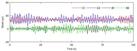 The dynamic response test of the electrical platform is carried out under the combined actions of wind, wave, and current and considering a storm surge elevation. The structural strain response of the electrical platform under three different attack angles, 0°, 45°, and 90°, was simulated under storm condition. Taking the platform with an attack angle of 90° as an example, the time-history curves of structural strain response at the four strain gauges around the measurement point S1 on the pile leg under storm condition C2 are shown in Figure 9. By analyzing the measured results of four strain gauges around the circumference of the pile leg at different positions, the results show that the measured results of the strain gauge at the outside of the platform structure are larger than those of the other three strain gauges.