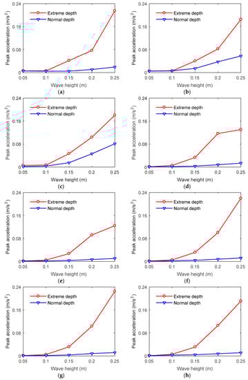 Structural peak accelerations at various measurement positions of the electrical platform with different water depths in waves for wave period of 1.6 s at attack angle of 90°. (a) J1; (b) J2; (c) J3; (d) J4; (e) J5; (f) J6; (g) J7; (h) J8.