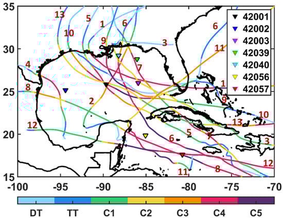 Buoy locations (colored triangles) and 1-h cubic spline interpolated tropical cyclone trajectories and category (colored lines). The number denotes the tropical cyclone as follows: (1) Andrew 1992; (2) Opal 1995; (3) Georges 1998; (4) Bret 1999; (5) Lili 2002; (6) Ivan 2004; (7) Dennis 2005; (8) Emily 2005; (9) Katrina 2005; (10) Rita 2005; (11) Wilma 2005; (12) Dean 2007; and (13) Ike 2008.
