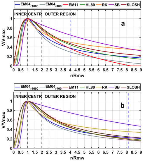 The Ro parameter varies between events and during the lifetime of an event. In the Atlantic basin, Ro has a median value of approximately 400 km [] or Ro ~ 10 Rmw for typical values of Rmw. However, Emanuel et al. [] and Emanuel and Ravela [] used a constant value of 1200 km, and Lin and Chavas [] used 400 km. In this study, we used Ro = 1000 km (EM04r1000) to represent the largest TCs in the GoM and the Caribbean Sea, while we used Ro = 400 km (EM04r400) to contrast the effect of Ro over the wind profiles.
