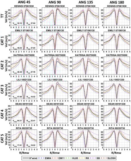 To assess the accuracy of the surface winds given by parametric wind models, we compared radial wind speed profiles of H*Wind, and parametric wind fields, from tropical storm category to cat5 and at each 22.5° (16 directions), considering the track direction as the reference. Figure 3 shows a subset of radial profiles comparison between parametric and H*Wind radial speed profiles per category. In general terms, parametric models do not include the effect of the environmental wind shear, environmental conditions (e.g., [,,,]), non-uniform surfaces (e.g., []) and land–sea friction contrast (e.g., []). Therefore, the large asymmetries shown by H*Wind wind speed profiles cannot be represented in many cases, resulting in significant biases in the wind speed intensity and Vmax location. The following patterns emerge from the results: