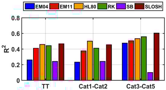 Figure 4 shows the mean coefficient of determination (r2) associated with all wind profiles grouped in tropical storms, minor categories (cat1 and cat2) and major categories (cat3–cat5), comparing the model results with H*Wind. In general, all models except SB improve their r2 with the increase of the TC category. SLOSH, HL80, RK, and EM11 shows similar r2 for TT (0.41–0.47) while HL80 shows the highest r2 in minor categories (0.50) followed by SLOSH and RK (0.45 and 0.41, respectively). For major categories, SLOSH is most accurate (0.60) followed by RK, HL80, EM11 and EM04 (0.56, 0.53, 0.50 and 0.48, respectively). EM11 and RK show similar results for all categories and EM04 only show good results for major categories. SB shows a very low r2 in all cases. As a general conclusion, the SLOSH model is the most accurate model for these cases.