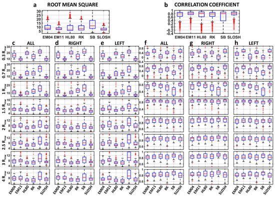 Root-mean-square error (RMS) and correlation coefficient (CC) boxplot wind speed comparison between time series of H*Wind and parametric models (a,b in top panels) and at normalized locations (each 22.5° clockwise from HURDAT2 TC trajectory and at different distances from the storm center, 0.3, 0.7, 1, 1.5, 2, 2.5, 3 and 4 *Rmw in each time step) for all (ALL) (c,f), right (RIGHT) (d,g), and left (LEFT) (e,h) quadrants. Time series represents all the time steps with H*Wind data. Each box represents the 25th percentile (bottom) and 75th percentile (top) bounding the median (middle line), the wider dash lines represent the 10th percentile (bottom) and 90th percentile (top), and red points represent above 90th percentile.