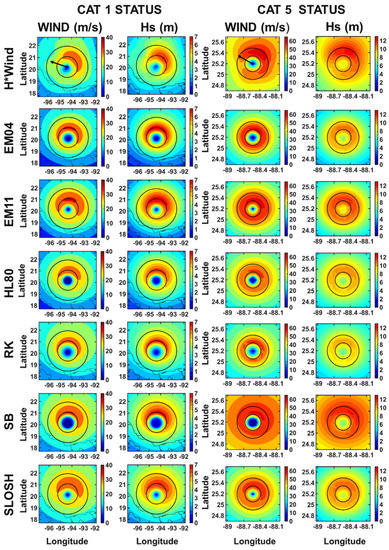 We used steady-state simulations for two events, Dean (2007) during category 1 and Rita (2005) during category 5, to analyze the wave field generation from different parametric wind models. The spatial distribution of the wave field for steady-state TCs are expected to resemble the wind field pattern, so the spatial distribution of Hs error is directly related to the capacity of the wind model to represent the TC winds. Figure 6 shows both the H*Wind and parametric wind fields (first and third columns), and the wave fields generated from H*Wind and parametric models (second and fourth columns), during hurricanes Dean (cat1) and Rita (cat5). In addition, as a reference, we include the H*Wind wind and Hs fields used for biases estimation in the first panels row. The overestimation of the Hs generated from parametric wind fields reaches maximum values of 1.8 m, associated with SB model during cat5 conditions, and 1.7 m associated with the EM11 model during cat1 conditions. These overestimated values correspond to 14.4% and 26.7% higher than the Hs generated from H*Wind wind fields, respectively. Similarly, the highest Hs underestimations are 3.3 m (51.1%) using the SB during cat1 conditions and RK with 3.1 m (25%) during cat5 conditions. In general, differences in the modeled wind fields are related to differences between the wind fields of H*Wind and the parametric models, showing that the parametric wind models cannot represent TC wind fields when the driving parameters are inaccurate, as shown by Phadke et al. []. From the results, we found that the relationship between wind and maximum Hs errors is larger in weak categories, suggesting that a correct definition of the Vmax parameter may be more relevant during weaker categories.
