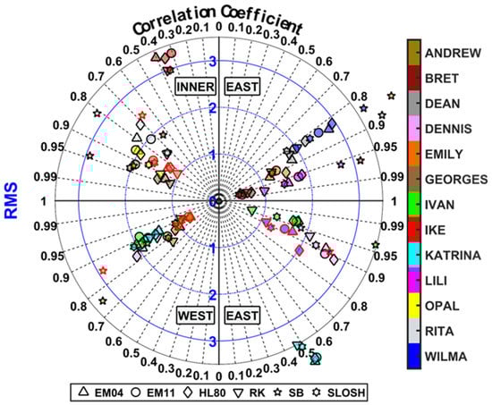 Circular diagram of root mean square error (RMS) (blue concentric circles) and correlation coefficient (CC) (radial black dotted lines) calculated from the resulting Hs covering 24 h before and after the TC crosses a particular buoy (shown by different symbols). The results are grouped in different quadrants according to the location of the buoy relative to the TC center (inner region when the buoy is located at less than one Rmw, and east and west depending on the buoy position with respect the translation direction of the TC). The events corresponding to Georges for buoy 42040 (inner region), Wilma for buoy 42057 (east) and Andrew for buoy 42001 (west) are represented with a red edge color to differentiate them at the buoys 42003, 42056 and 42003 respectively (black edge color). The SB model results for Katrina in buoy 42001 and Emily in buoy 42056 do not appear as they have very high RMS values and are outside the plot limits (RMS = 4.52; 4.31 and CC = 0.89; 0.85 respectively).
