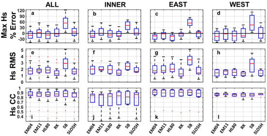 Figure 10 summarizes the accuracy of the wave modeling results based on the Hsmax, RMS, and CC boxplot of the time series. For Hsmax percent error, RK shows the best fit for all areas (Figure 10a) followed by EM11 and SLOSH. SB shows large overestimations and HL80, and EM04 underestimate the median despite showing relatively good results. In the inner region (Figure 10b), RK also shows the better fit, although EM04 has a very similar distribution, and it is followed by HL80. For the east area (Figure 10c), RK also provides the best fit, followed by SLOSH and EM11. The largest overestimations of Hsmax was by SB, including all cases and all areas. The lowest RMS error (Figure 10e–h) is obtained by the RK model, followed by SLOSH, EM04, EM11, and HL80, which have similar distributions, while SB has a larger RMS than all other models. For the CC (Figure 10i–l), the values are very similar, although they are higher for EM04, which shows a distribution with low dispersion around 0.85. Similar to the analysis for Hs, we analyzed time series of mean and peak wave period as part of our study, obtaining similar results (not shown).