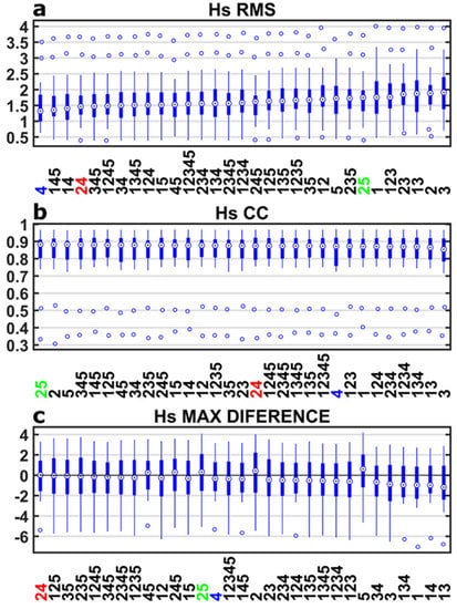 Significant wave height: (a) root-mean-square error; (b) correlation coefficient; and (c) difference between maximum simulated and measured. The numbers in the x-axis indicate the models included in each permutation: (1) EM04; (2) EM11; (3) HL80; (4) RK; and (5) SLOSH. The error measures are calculated from the time series selected by 24 h before and after the TC crosses the buoys. Each box represents the 25th percentile (bottom) and 75th percentile (top), the median is the blue circle with a black point inside, the blue lines represent the 10th percentile (bottom) and 90th percentile (top), blue circles points represent above and below 90th percentile and 10th percentile. The error measures are ordered from less to more error denoting the results in blue RMS, green for CC, and red for the maximum difference.