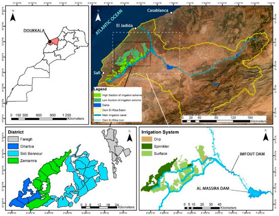 The water resource mobilized to irrigate the Doukkala comes mainly from the Al Massira dam, one of the main water storage structures in the Oum Er-Rbia basin, with a capacity of about 2.7 × 109 m3. Al Massira reservoir is one of the largest reservoirs in Morocco, with multiple uses: drinking water, agriculture, industry, and energy.