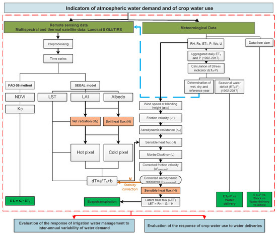 The approach briefly described in the introduction leads to the detailed workflow in Figure 2, which shows how the evaluation of the net atmospheric water demand relates to the detailed analysis on actual crop evapotranspiration and how the different streams of data analysis lead to the evaluation (see red arrow, Figure 2) of the response of irrigation water management to irrigation water demand and of crops to water supply. The indicators of water demand are evaluated by merging meteorological and remote sensing data (see blue arrow, Figure 2). The aerodynamic resistance, once corrected for stability is applied to determine the relationship between dT and Ts (see brown arrow, Figure 2). The elements of the workflow are described in some detail in the following sections.