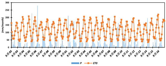 The first step in the work-flow described in Section 3.1 is the evaluation of the net atmospheric water demand ET0-P. We have calculated first daily ET0-P for each year in the period 1992–2016. The precipitation P is the time series obtained by merging available observations as described in Sect, 2 (meteorological data).