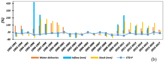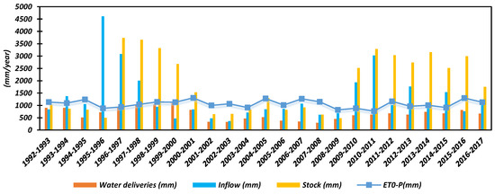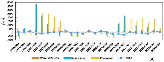 On the basis of the analysis described in Section 3.6.1, we have identified (see Section 4.1) in the period 1992–2017 a dry year, i.e., the largest ET0-P, a wet year, i.e., the smallest ET0-P, and a reference year, i.e., the median ET0-P. The availability of satellite data restricted this analysis to the years 2013–2014 (reference), 2014–2015 (wet), and 2015–2016 (dry) (see Section 2.4).