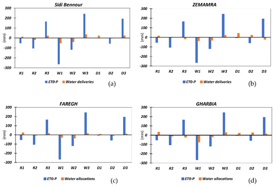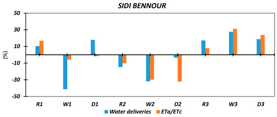 Sidi Bennour (Figure 10): Relative changes in water delivery and relative evapotranspiration ETa/ETc were comparable for the first, second, and third quarters in the reference year, in the second and third quarters in the wet year and in the third quarter in the dry year. In the first quarter of the wet year the relative anomalies in ETa/ETc were much smaller than relative anomalies in water delivery. In this case water delivery was reduced taking into account the very large precipitation (P) in same quarter. Specifically, the precipitation in this quarter (Table 4) was 226% of the average over all quarters and all years. The large precipitation was sufficient to maintain high ETa/ETc. In the 2nd quarter of the dry year, the water delivery was not increased to compensate the larger than average ET0-P and was even slightly lower than the average. As a consequence, ETa/ETc was equal to 0.66, i.e., much lower than the average over all quarters and all years. In the first quarter of the dry year, ET0-P was much larger than in the same quarter of the other years. Water deliveries were increased by 18% above the average, which apparently was sufficient to maintain the ETa/ETc roughly constant. This is what adaptive irrigation water management should achieve.