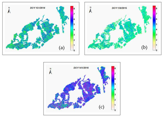 Doukkala irrigation scheme: actual evapotranspiration ETa estimated by applying SEBAL to multispectral L8/OLI, TIRS image data in May: (a) reference year 2013–2014, (b) wet year 2014–2015, and (c) dry year 2015–2016.