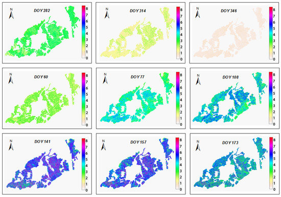 The evolution through the year 2015–2016 (Figure 8) reflect the expected seasonality, but the higher ET0, which characterized this year lead to a larger winter-summer difference in ETa. Likewise, the drier conditions in 2015–2016 led to a larger spatial variability in ETa in spring and summer. Differences up to 6 mm d−1 can be noticed in ETa on DoY 157, which suggest large differences in the distribution and use of irrigation water, these results clearly require detailed data on water delivery to and within the areas served by tertiary canals for a better understanding of irrigation water management in the Doukkala.