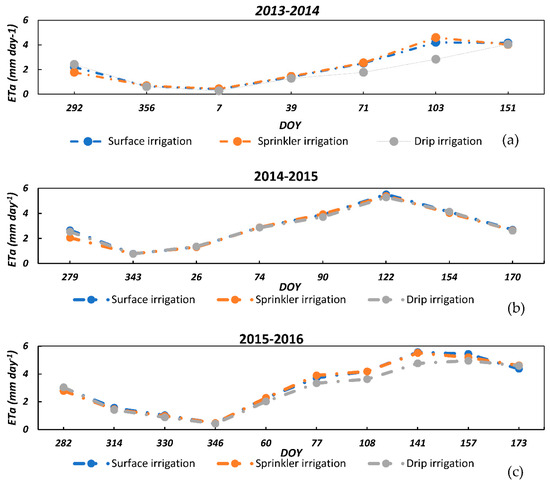 Doukkala irrigation scheme: actual daily evapotranspiration ETa estimated by applying SEBAL to multispectral L8/OLI, TIRS image data and averaged over areas dominated by surface, sprinkler and drip irrigation in the: (a) reference year 2013–2014, (b) wet year 2014–2015, and (c) dry year 2015–2016.