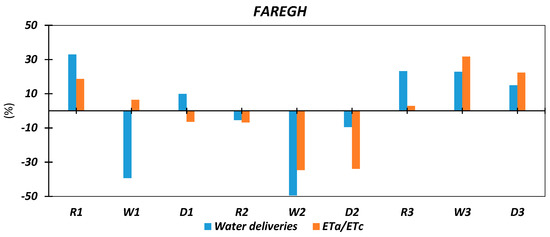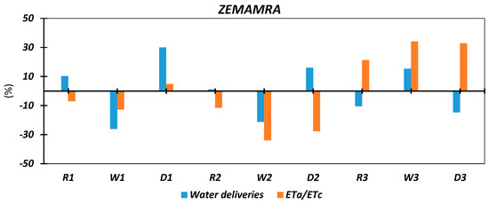 We have applied two indicators of crop water use, i.e., ETa and the ratio ETa/ETc, and compared the absolute and relative anomalies in both indicators with the anomalies in water deliveries.